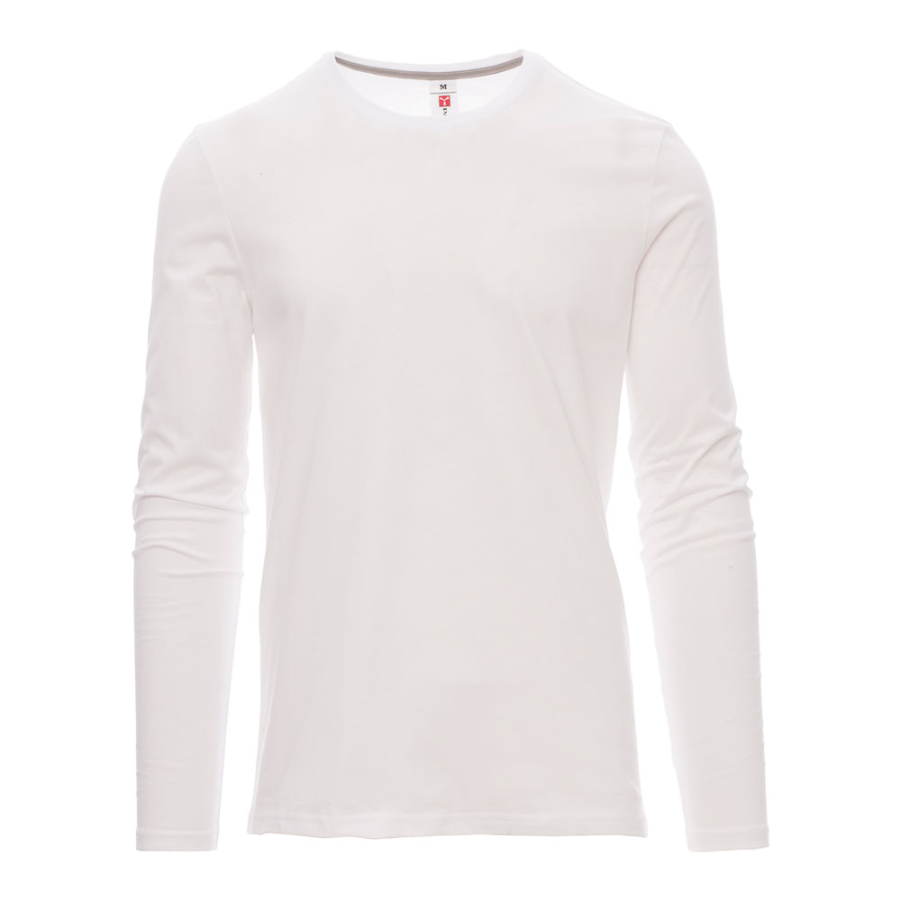 Men’s long-sleeved crew neck t-shirt, with 1.5 cm spandex mix rib neckband with top stitching on the front, contrasting shoulder-to-shoulder reinforcement tape visible on the inside collar, stretch seams, side seams, 165 gr/m2. Material 100% cotton.