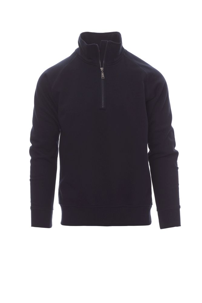 Men’s sweatshirt, with matching half zip in plastic with metal pull, raglan sleeves, stretch rib cuffs and hem, reinforced seams. 80 % cotton a 20 % polyester, 280 gsm.