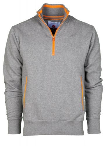 Men’s sweatshirt with half zip in contrasting coloured plastic with metal pull, contrasting trim on the collar and side pockets. Fitted sleeves, stretch rib cuffs and hem, reinforced seams.