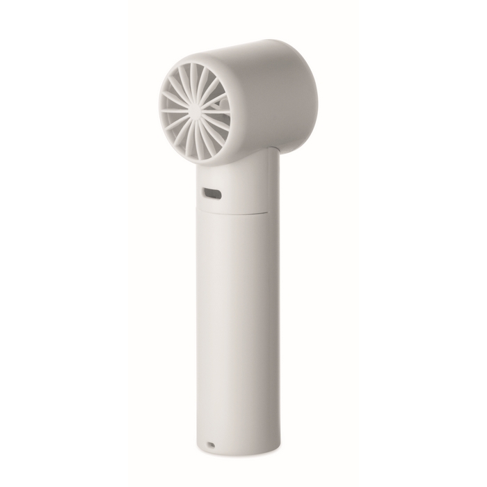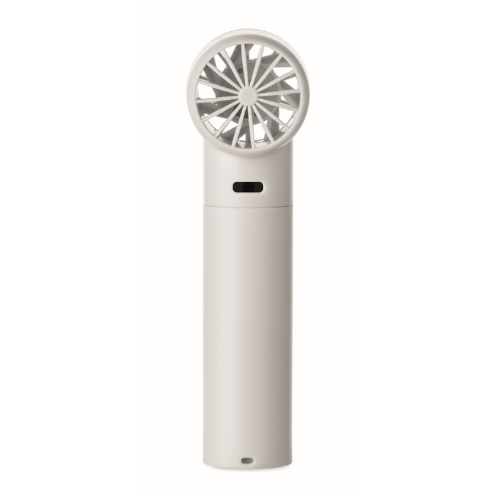 Mini handheld fan in ABS with screen display and 5 speed settings. Includes replaceable 2600mAh rechargeable lithium battery. Dimensions: 13.5 x 4 x 4 cm