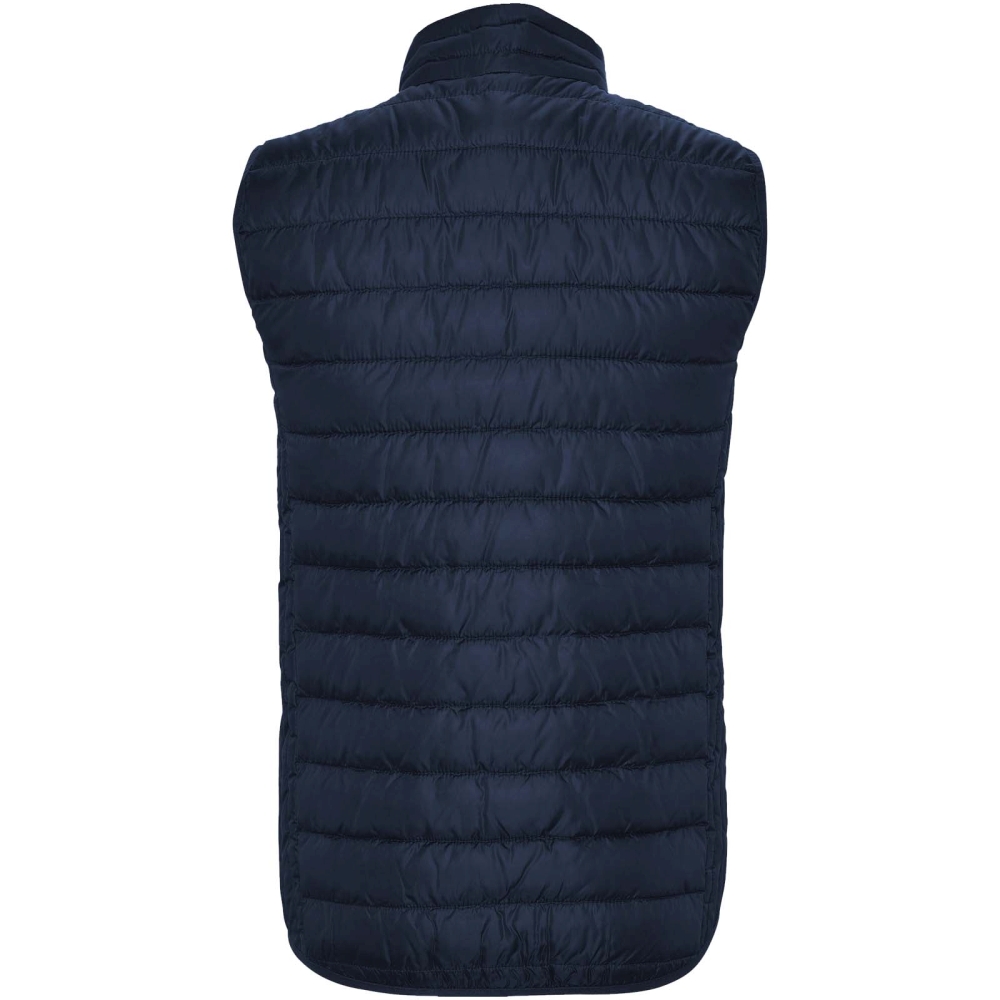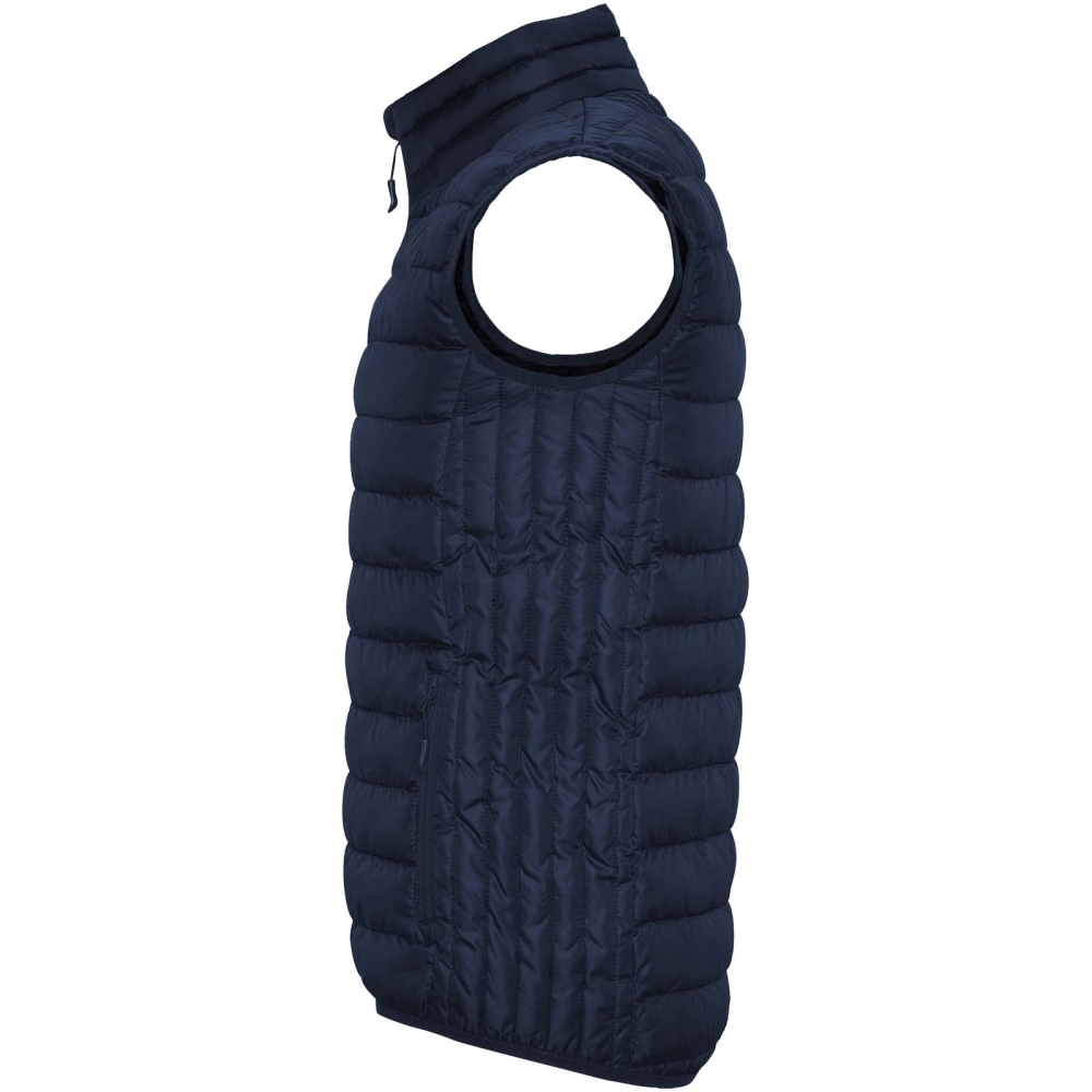 Gilet vest with feather touch filling. Inverted zips with matching chin protector and puller. Two side pockets with zip. Elastic trim in hem and armholes. Contrasting inner lining. Light and foldable garment. Water resistant. Wind-proof model.