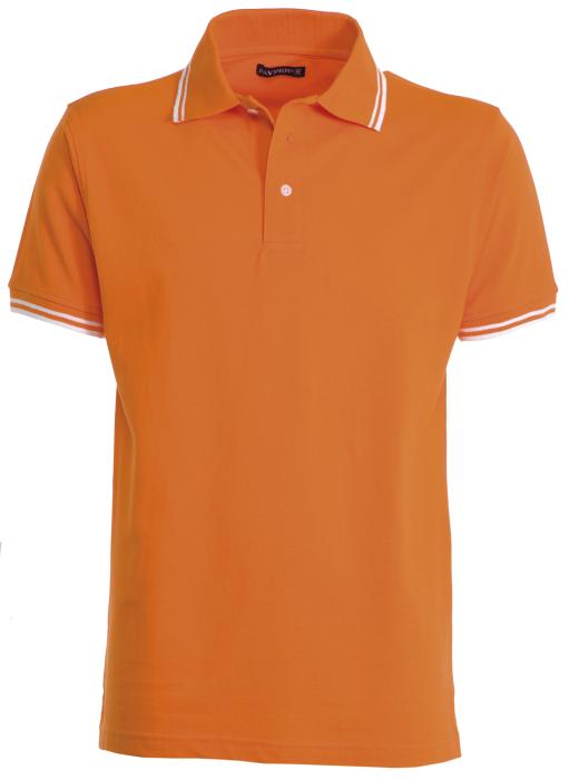Short sleeve mens polo shirt with three white buttons, collar and sleeve edge with fine contrasting trim, ribbing on sleeve edges, side vents, concealed stitching on collar and reinforcement tape on both sides. 100% cotton piqué, 210 gsm. Sizes: S-M-L-XL-XXL-XXXL.