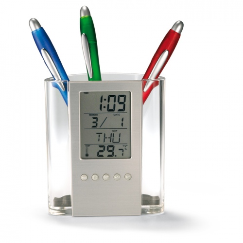 Penholder with calendar alarm clock and thermometer. 1 cell battery included. Product size: 10,3x5,4x11,8 cm