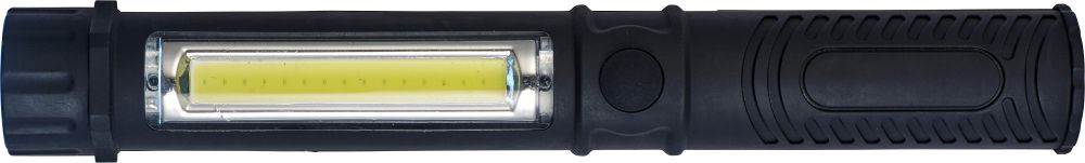 Plastic work light/torch with COB lights on top and in the holder. Batteries included.