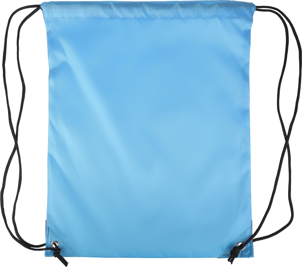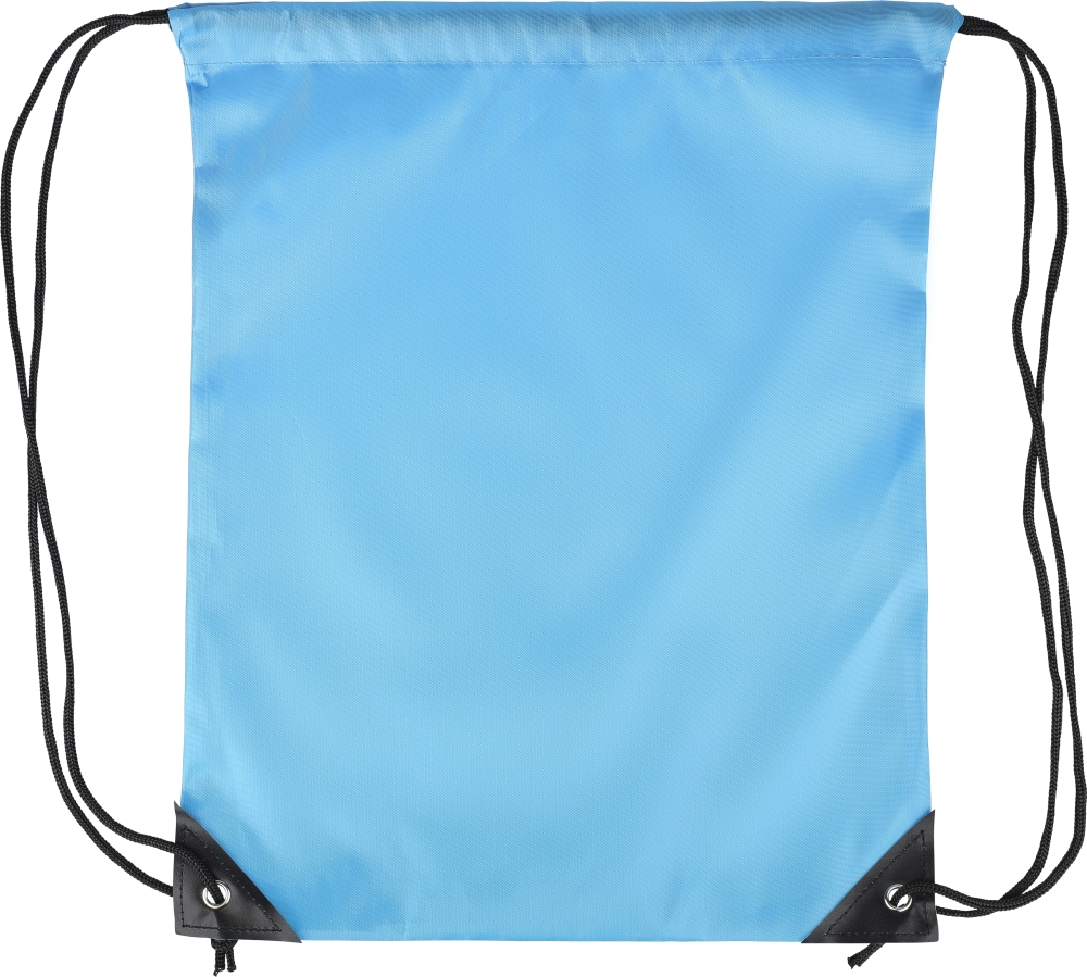 Polyester 210D drawstring backpack with two black PU corners on the front and internal sewing. Features a black nylon cord on each side, a pull-cord closure, and one inner compartment. Capacity: 5L. Carrying capacity: 7 kg. Dimensions: 34 x 0,1 x 42 cm