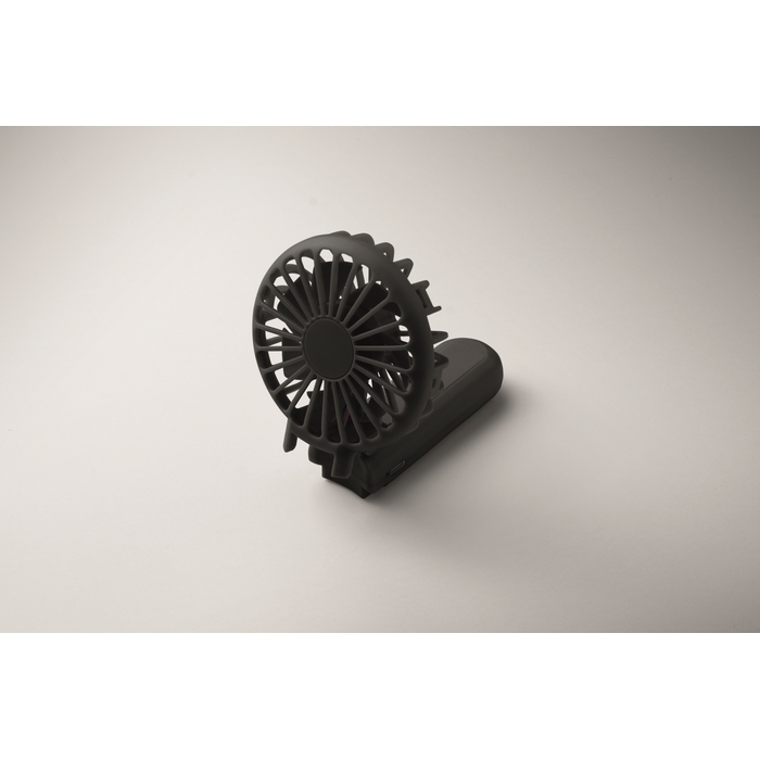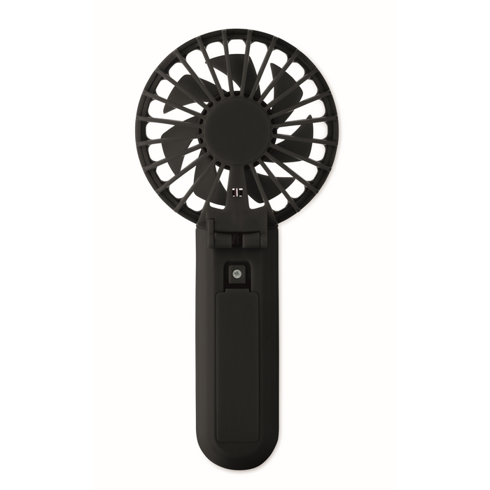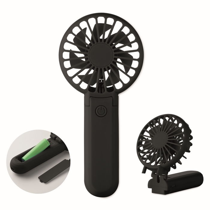Portable foldable fan in ABS with 3 speed settings. Can be used as handheld or desk fan. Includes 1 replaceable and rechargeable 14500 Lithium battery 500 mAh. Dimensions: 8 x 17.2 x 2.7 cm