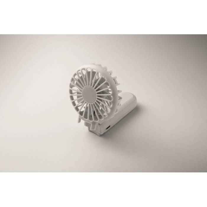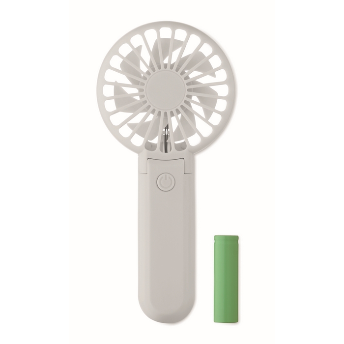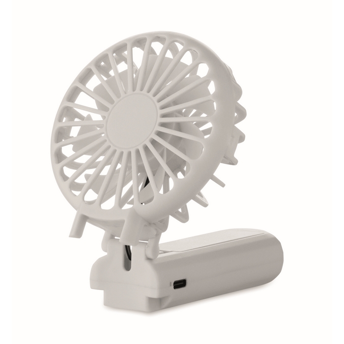 Portable foldable fan in ABS with 3 speed settings. Can be used as handheld or desk fan. Includes 1 replaceable and rechargeable 14500 Lithium battery 500 mAh. Dimensions: 8 x 17.2 x 2.7 cm