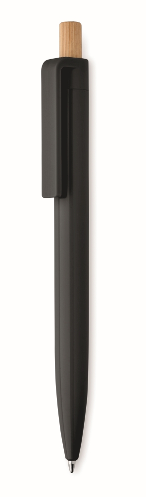 Ball pen in recycled ABS with bamboo push button. Blue ink. Dimensions: 13,4 x 1,5 x 1,1 cm