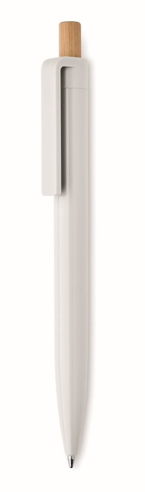 Ball pen in recycled ABS with bamboo push button. Blue ink. Dimensions: 13,4 x 1,5 x 1,1 cm