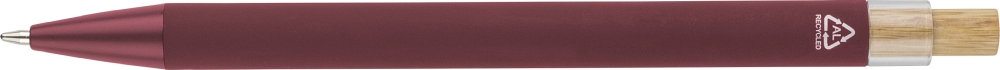Recycled aluminium ballpen with bamboo push button featuring an AS plastic detail. Includes a metal clip and plastic tip, both in matching colors. Laser-engraved recycled logo on the barrel. Approximate writing length of 800 metres. Blue ink. Dimensions: 1 cm x 1,25 cm x 14 cm