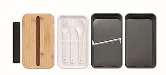 Recycled PP two-tier lunch box with removable divider and 3 cutlery utensils with attachable polyester band with bamboo lid. The lid has a phone stand functionality. Capacity: 400 ml (2x). Bamboo is a natural product, there may be slight variations in colour and size per item, which can affect the final decoration outcome.