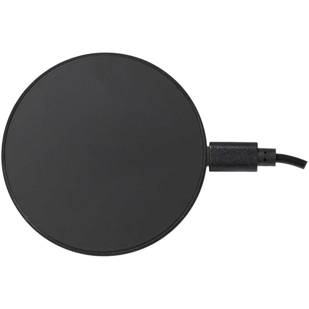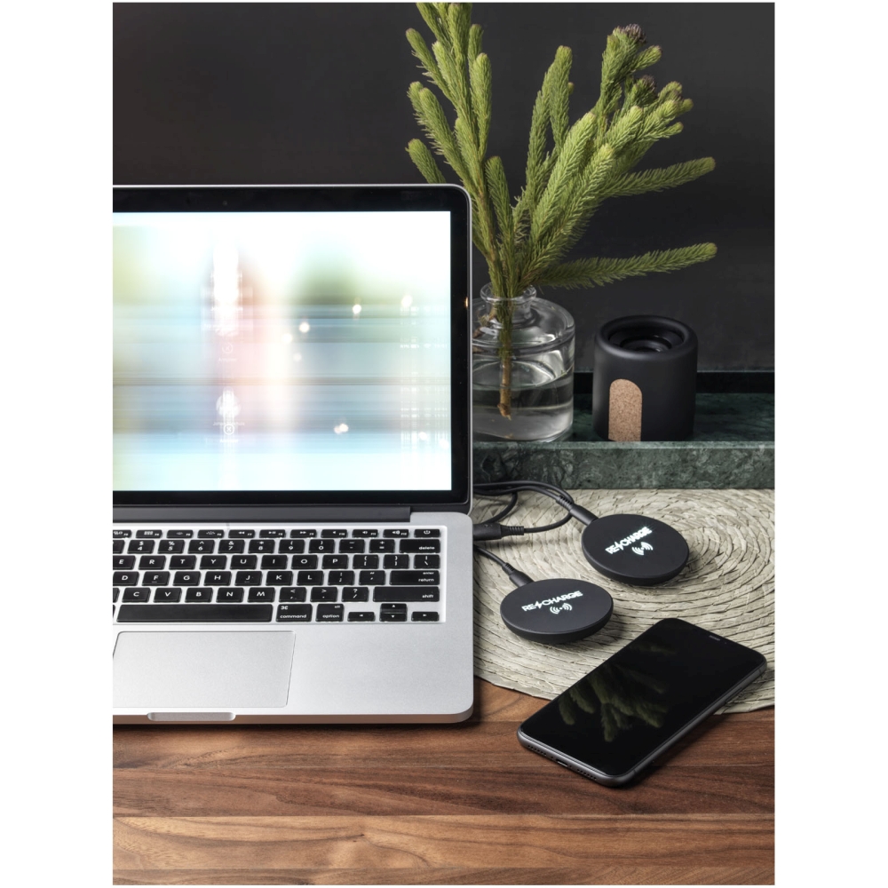 10W wireless charging station with light-up logo and antibacterial treatment, with a charging cable made of recycled PET. Delivered in a black gift box of recycled paper with magnetic closing mechanism. Patent EUROPE EUIPO. Dimensions: 1 x O 6,8 cm