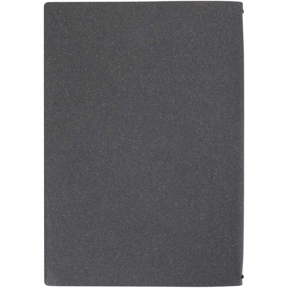 The Slyk A5 refillable cahier notebook features a recycled plastic cover with an elastic band closure that securely holds two internal cahiers—one dotted and one lined. Each cahier includes 32 cream-coloured sheets made from 70 g/m2 paper, with rounded corners and visible spine stitching for a handcrafted look. The covers of the cahiers are made from cardboard. Cahier refills are available separately in a variety of layouts, including dotted, planner, and ruled. Dimensions: 21 x 14 cm