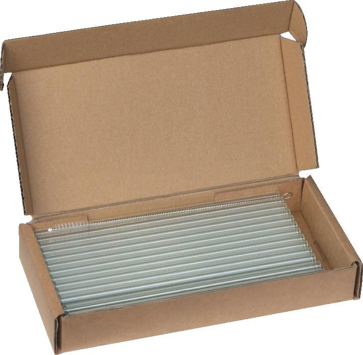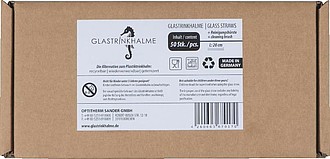 Environmentally friendly, reusable and tempered glass drinking straw with 20 cm length. This article is delivered in a box with 50 pieces including cleaning brush. Dishwasher safe. Your advertising is lasered onto the straw. The price is per straw.