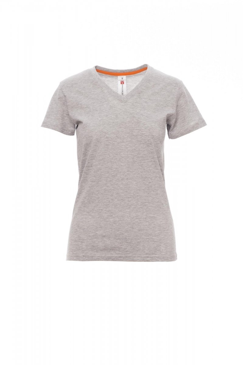 Women’s V neck fitted t-shirt, with 1.5 cm spandex mix rib neckband with top stitching on the front, contrasting shoulder-to-shoulder reinforcement tape visible on the inside collar, stretch seams, side seams.