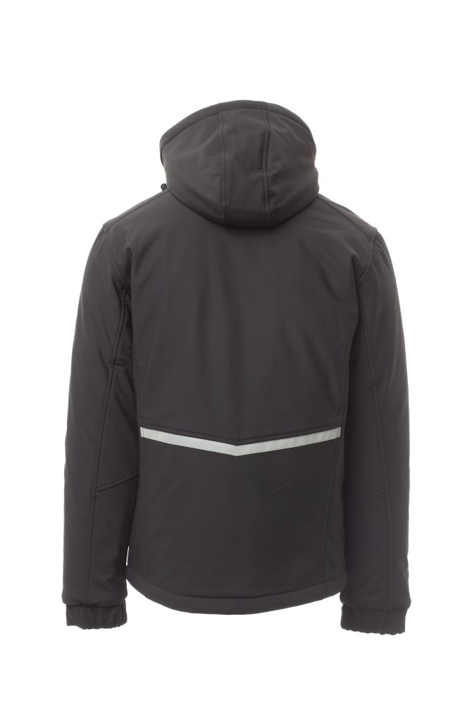WP 8000 mm H2O, WVT 5000 g/m2 24h. Men’s padded soft-shell, SBS zip closure with "semi-auto lock" metal slider and customised pull. Adjustable and detachable hood with drawstring. Inner collar with polar fleece side details. Retroreflective strips on the lower back and back of the hood. Elasticated cuffs, adjustable with Velcro. Two side pockets with zip fastening, a breast pocket with coated zip and a pocket on the left arm with integrated pen holder, closed with a zip. Fluorescent pullers. One internal welt pocket, closed with Velcro. Adjustable bottom with customised stoppers.
