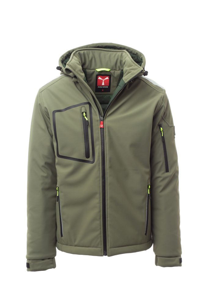 WP 8000 mm H2O, WVT 5000 g/m2 24h. Men’s padded soft-shell, SBS zip closure with "semi-auto lock" metal slider and customised pull. Adjustable and detachable hood with drawstring. Inner collar with polar fleece side details. Retroreflective strips on shoulders, lower back and back of the hood. Elasticated cuffs, adjustable with Velcro and inner sleeve. Heat-sealed breast pocket, closed with coated zip. Two side pockets, closed with a zip with a retro-reflective detail. Left arm pocket with integrated pen holder, closed with a zip. Fluorescent pullers. Two inside pockets, one shaped breast pocket with zip on the right and one tablet holder closed with Velcro. Adjustable bottom with customised stoppers.