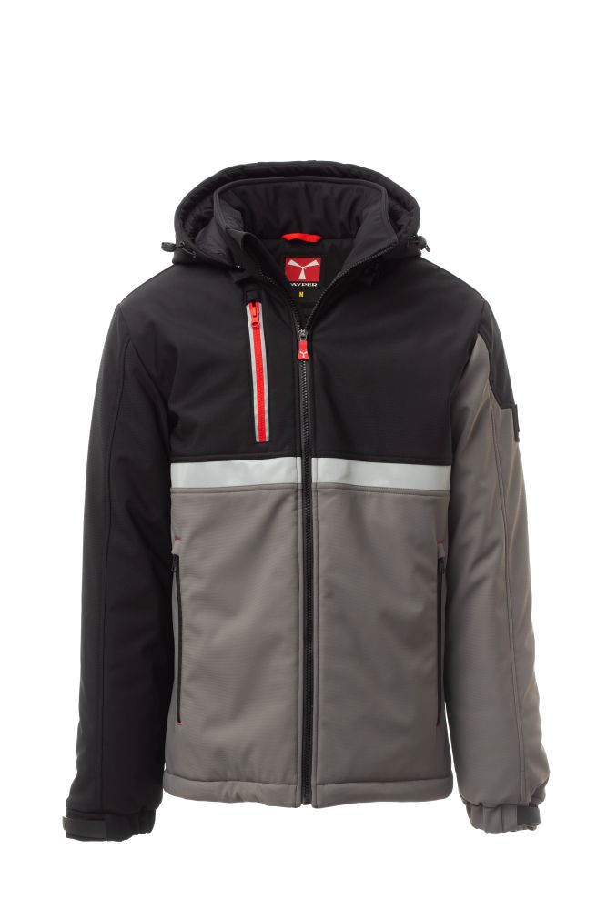 WP 8000 mm H2O, WVT 5000 g/m2 24h. Men’s padded soft-shell, SBS zip closure with "semi-auto lock" metal slider and customised pull. Adjustable and detachable hood with drawstring. Front retroreflective strip on chest. Elasticated cuffs, adjustable with Velcro and inner cuff. Two side pockets with zip and a breast pocket with zip with retroreflective detail. “Life-saving" element on the back, with internal retroreflective logo, closed with zip. Two internal pockets: one right shaped breast pocket with zip and one tablet holder pocket closed with Velcro. Adjustable bottom with customised stoppers.