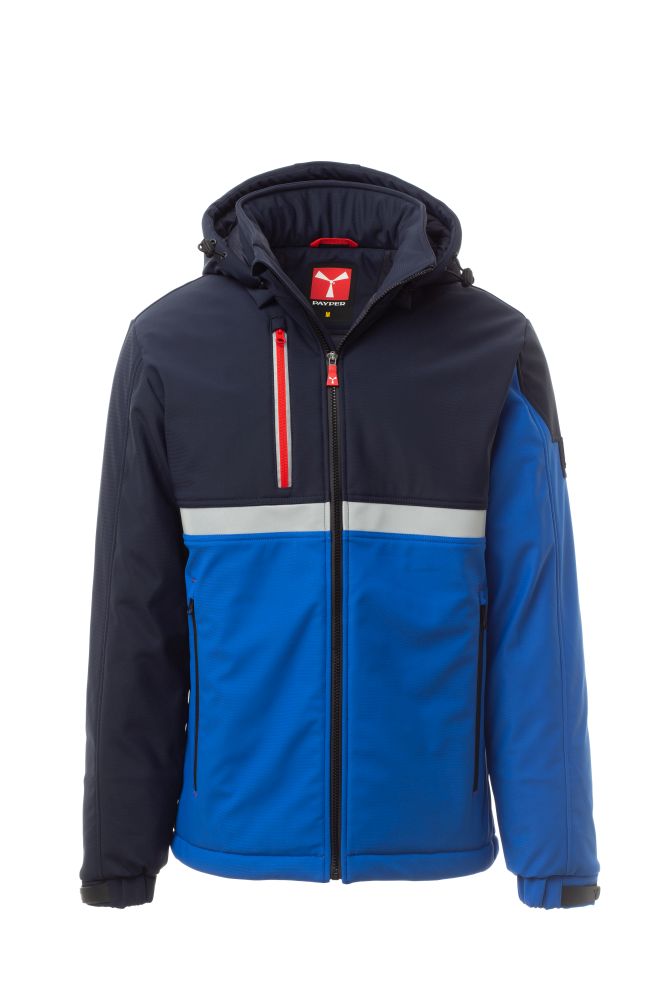 WP 8000 mm H2O, WVT 5000 g/m2 24h. Men’s padded soft-shell, SBS zip closure with "semi-auto lock" metal slider and customised pull. Adjustable and detachable hood with drawstring. Front retroreflective strip on chest. Elasticated cuffs, adjustable with Velcro and inner cuff. Two side pockets with zip and a breast pocket with zip with retroreflective detail. “Life-saving" element on the back, with internal retroreflective logo, closed with zip. Two internal pockets: one right shaped breast pocket with zip and one tablet holder pocket closed with Velcro. Adjustable bottom with customised stoppers.