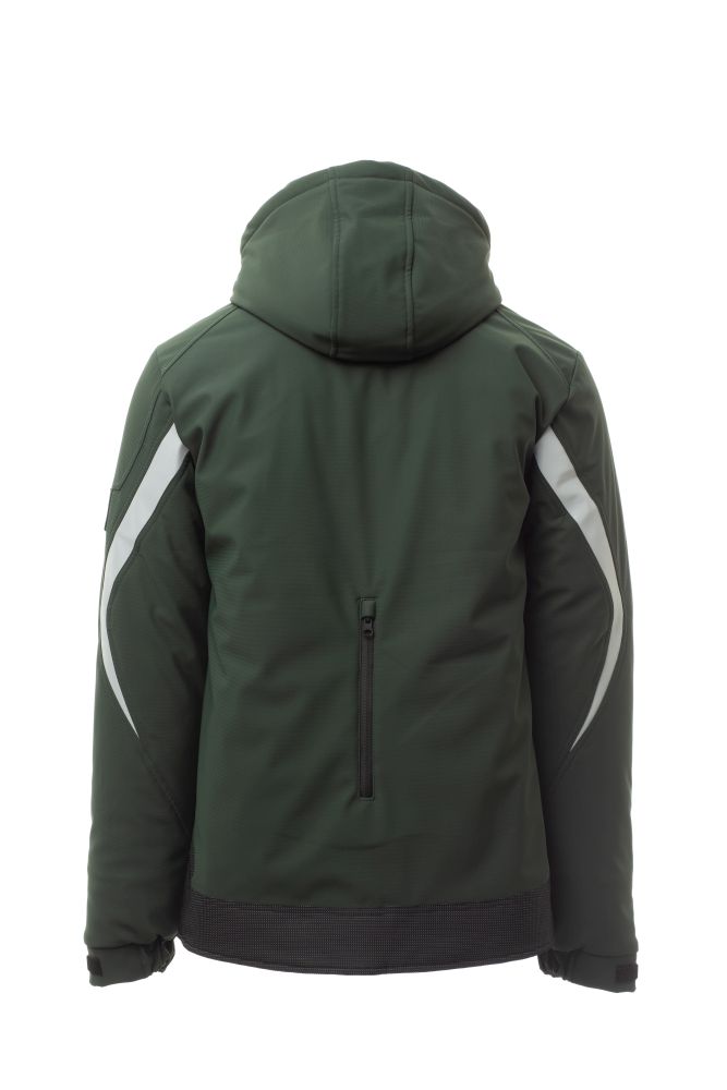 WP 8000 mm H2O, WVT 5000 g/m2 24h. Men’s padded soft-shell, SBS zip closure with "semi-auto lock" metal slider and customised pull. Adjustable and detachable hood with drawstring. Retroreflective strip on shoulders and arms. Elasticated cuffs, adjustable with Velcro and inner cuff. Lock System breast pocket with flap, badge holder and pen holder. Two side pockets closed with a coated tape zip. “Life-saving" element on the back, with internal retroreflective logo, closed with coated zip. Two internal pockets, one tablet holder pocket closed with Velcro and one shaped breast pocket with zip on the right. Adjustable bottom with customised stoppers. Dotted fabric with retroreflective effect.