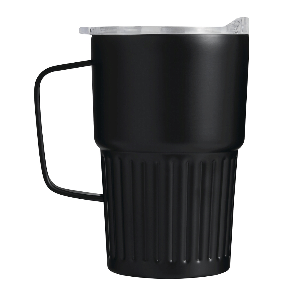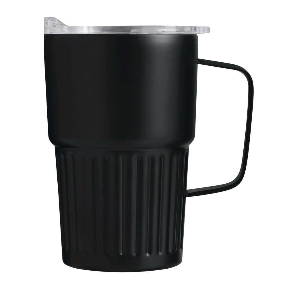 Vacuum drink mug, double-walled: inside made of recycled stainless steel, outside made of stainless steel, practical handle, plastic lid with silicone sealing ring and integrated sliding drinking opening, capacity approx. 450 ml, keeps warm for approx. 4 hours and cold for up to 8 hours, in a box. Dimensions: O8,7 x 14 cm
