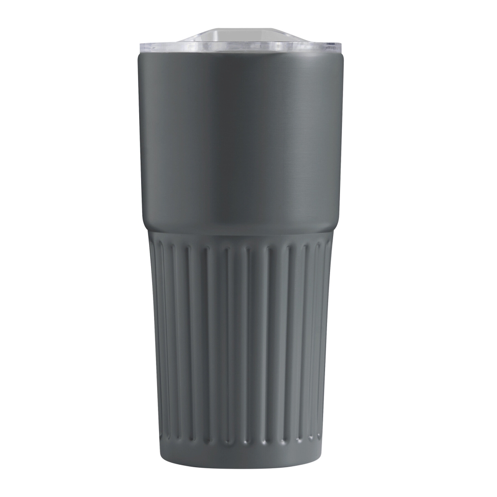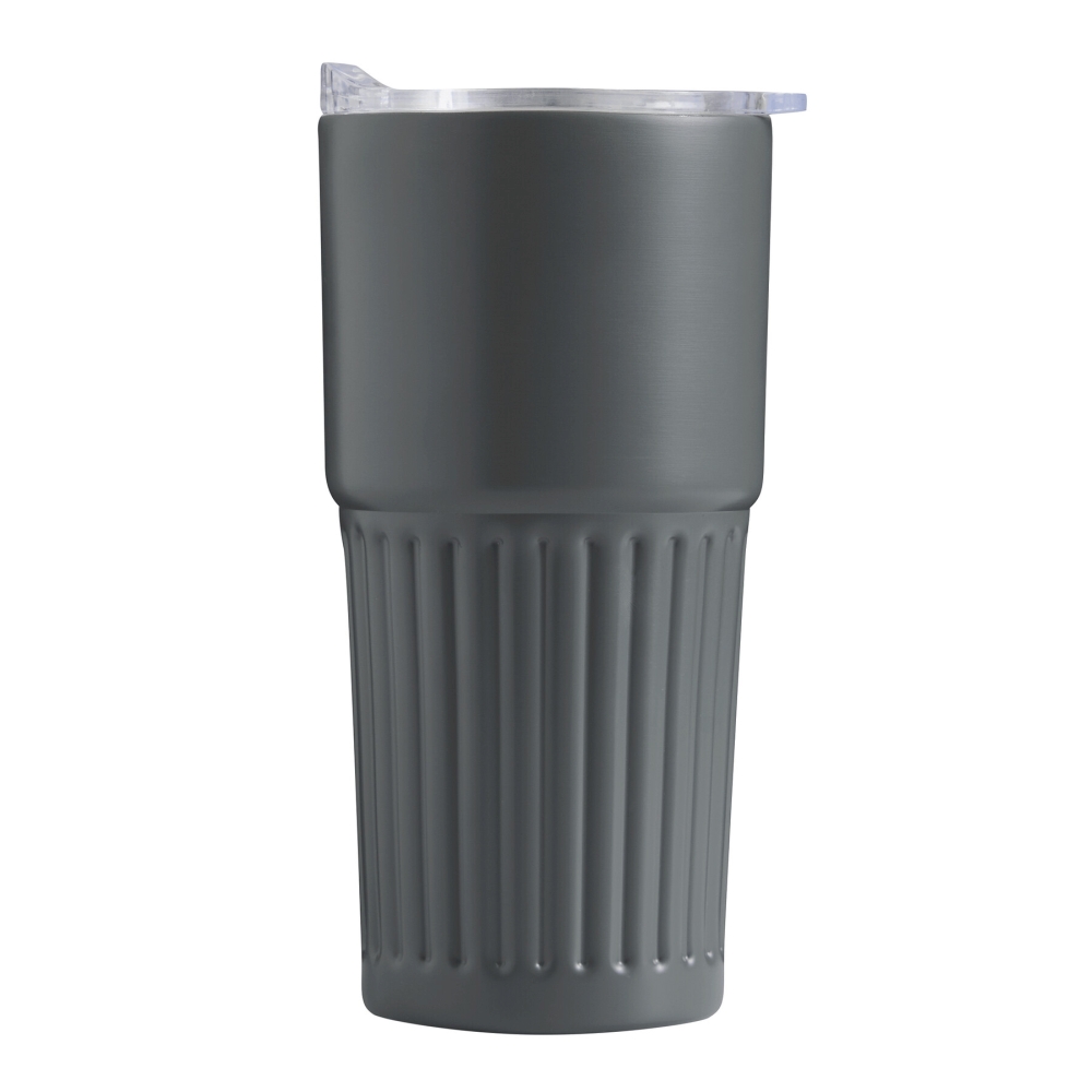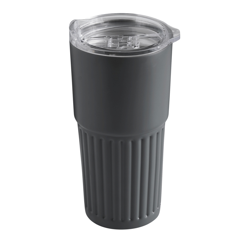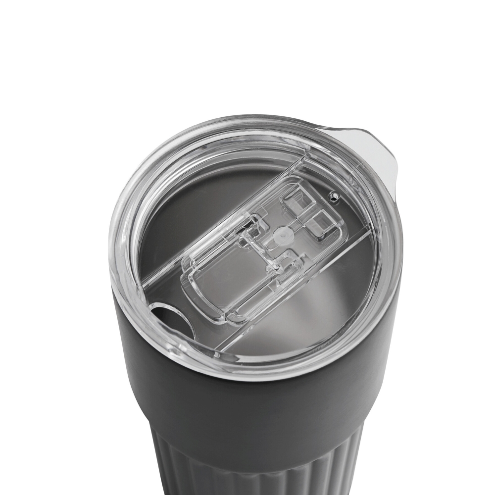 Vacuum drink mug, double-walled: inside made of recycled stainless steel, outside made of stainless steel, plastic lid with silicone sealing ring and integrated sliding drinking opening, capacity approx. 600 ml, keeps warm for approx. 4 hours and cold for up to 8 hours, in a box. Dimensions: O8,7 x 18 cm