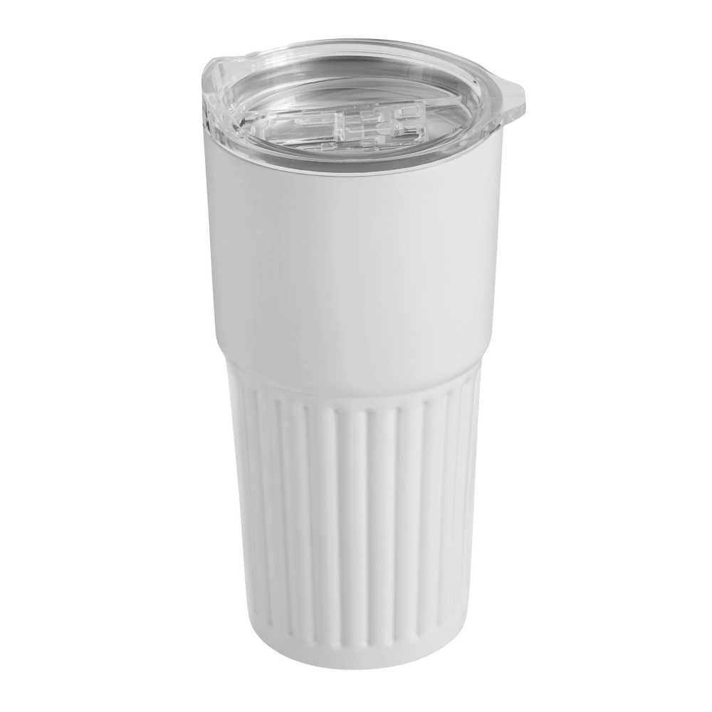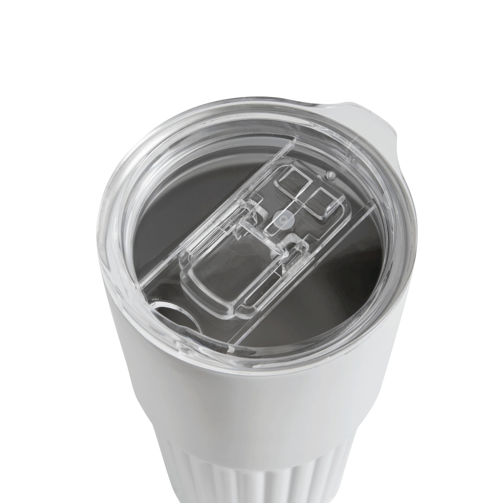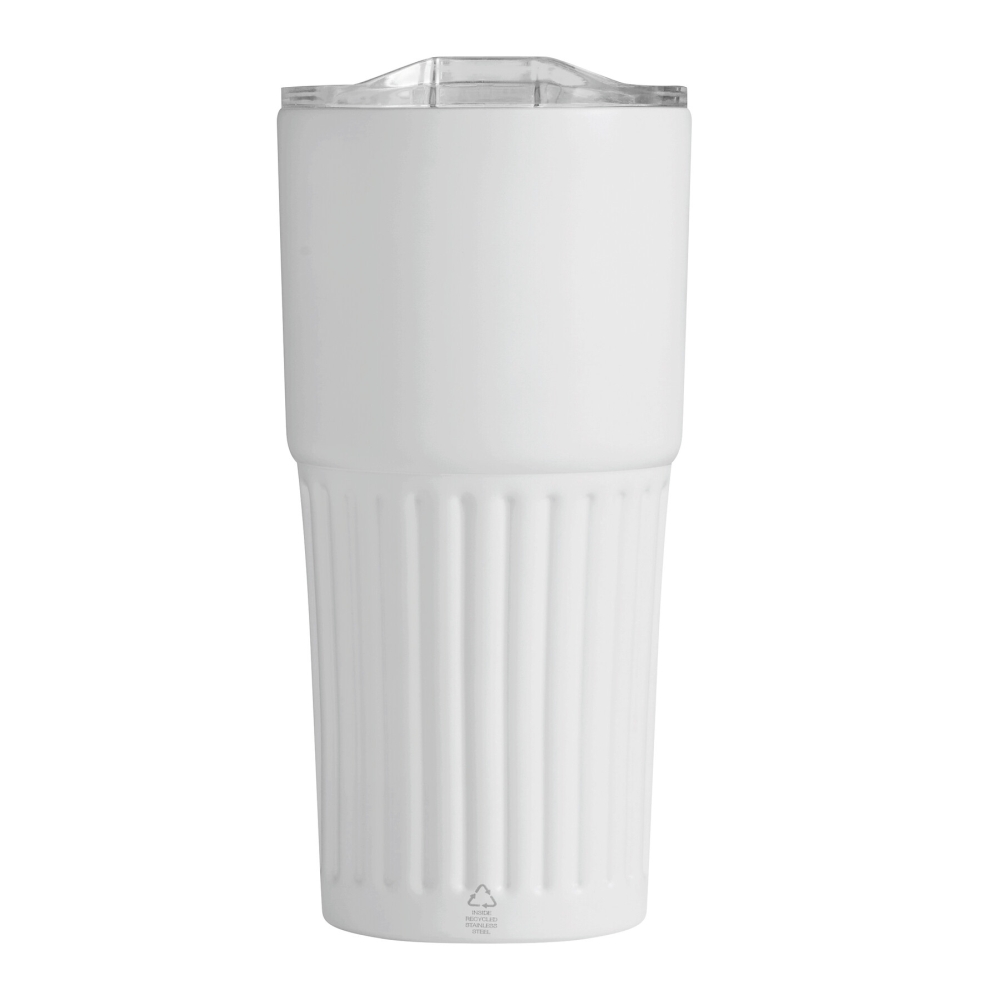 Vacuum drink mug, double-walled: inside made of recycled stainless steel, outside made of stainless steel, plastic lid with silicone sealing ring and integrated sliding drinking opening, capacity approx. 600 ml, keeps warm for approx. 4 hours and cold for up to 8 hours, in a box. Dimensions: O8,7 x 18 cm