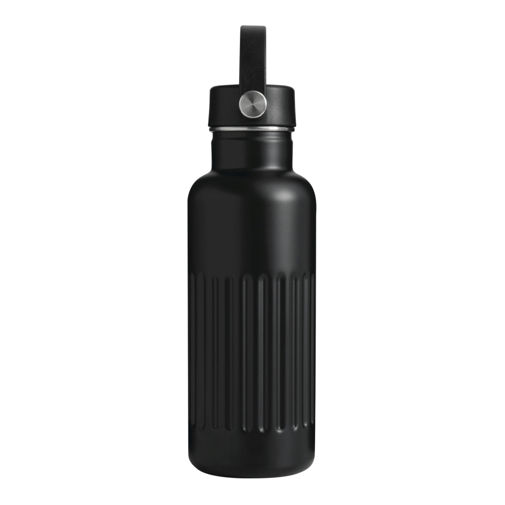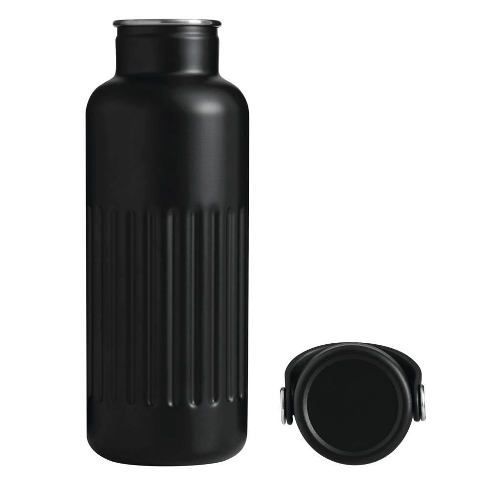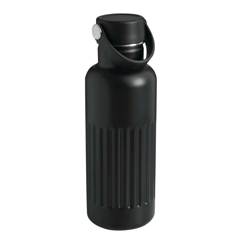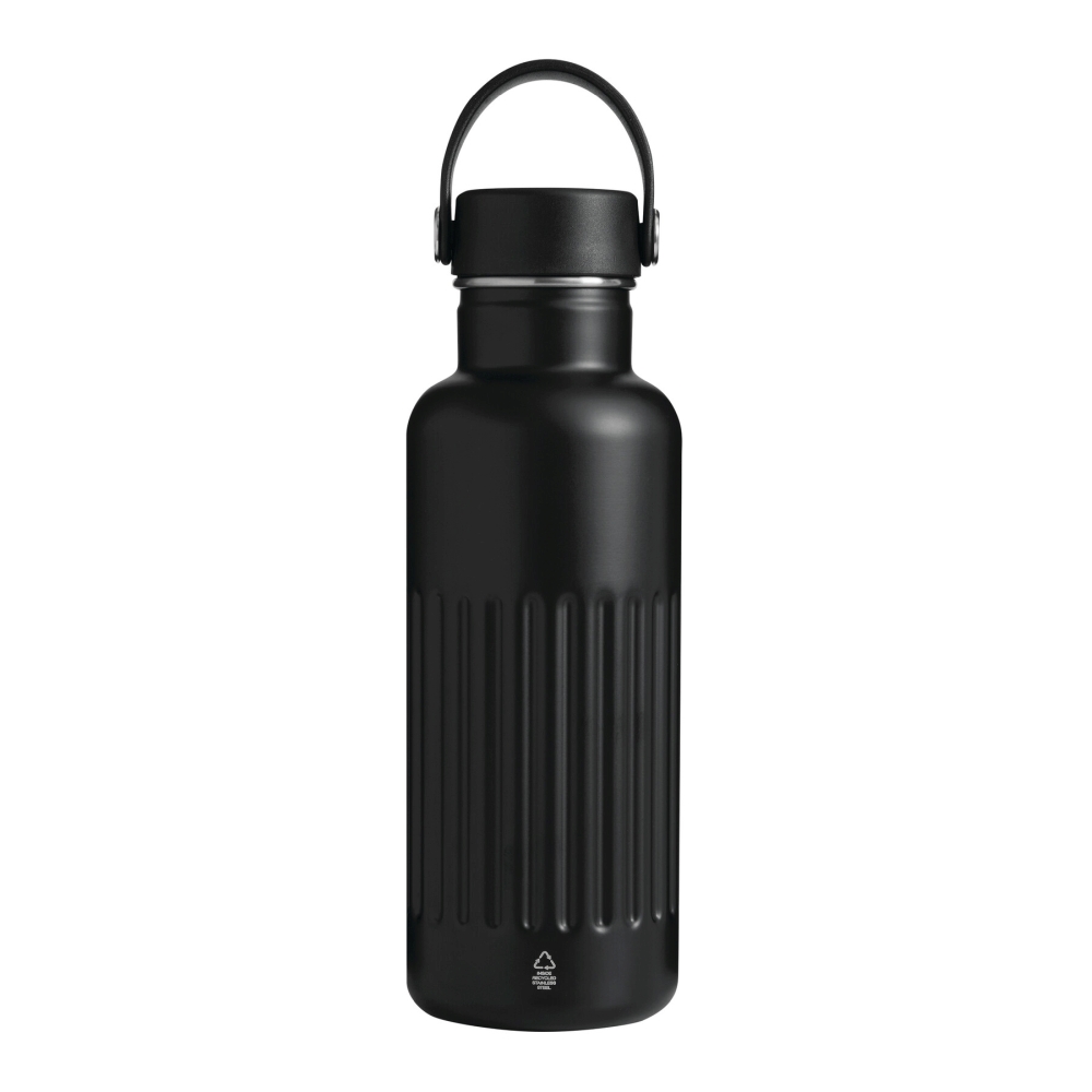 Vacuum drinking bottle, double-walled: inside made of recycled stainless steel, outside made of stainless steel, lid with secure screw cap, silicone sealing ring, and plastic carrying strap, capacity approx. 500 ml, keeps warm for approx. 8 hours and cold for up to 12 hours, in a box. Dimensions: O7 x 22,5 cm