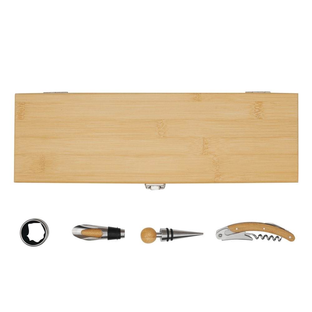 Wine set, 5 pieces, for 1 bottle: comprises stainless steel drip ring, metal bottle stopper with wooden knob, metal pourer with wooden sealing stopper, and stainless steel waiters knife with wooden handle, in bamboo case and in a box. Dimensions: 36 x 11,5 x 11,5 cm