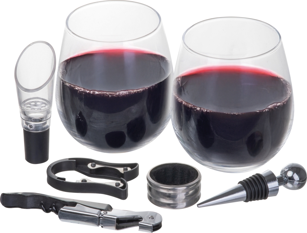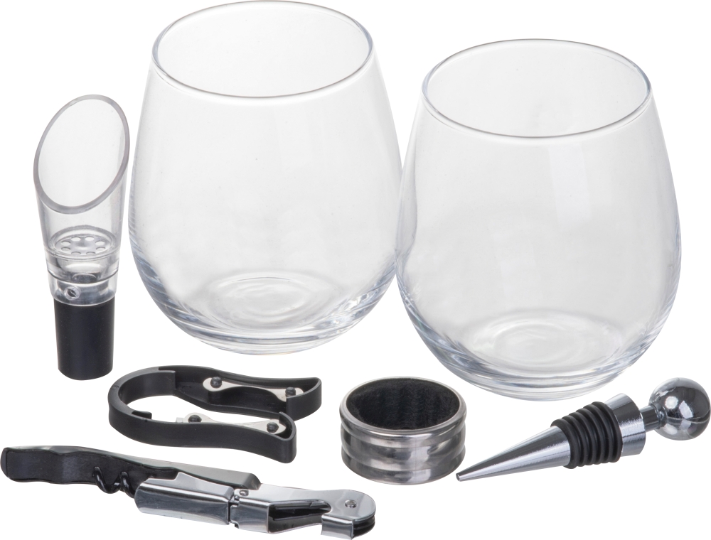 Comprehensive wine set with two glasses (440 ml), corkscrew, wine stopper, pourer, wine ring, and foil cutter. Dimensions: 21,5 x 18,6 x 12,5 cm